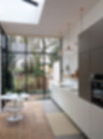 Une extension minimaliste composée d'un cube de verre et d'acier a permis de placer une large cuisine au coeur de la maison.